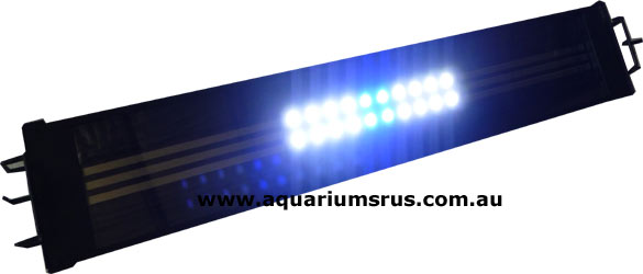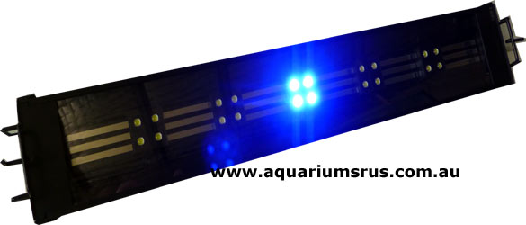 BRAND NEW! Slim line LED Track light fitting is fully adjustable to your needs. The light pods (see below for variations) slide along the track to spread light out as required. It is incredibly easy to clip in extra light pods to increase the intensity of the light. Dimmable blue pods can be operated on their own for moonlight settings. Slide out legs to suit a wide range of aquarium sizes, including non-standard sizes. Fabulous for use with a range of tanks, very long life (up to 30,000 hours), low cost and very low power consumption! |